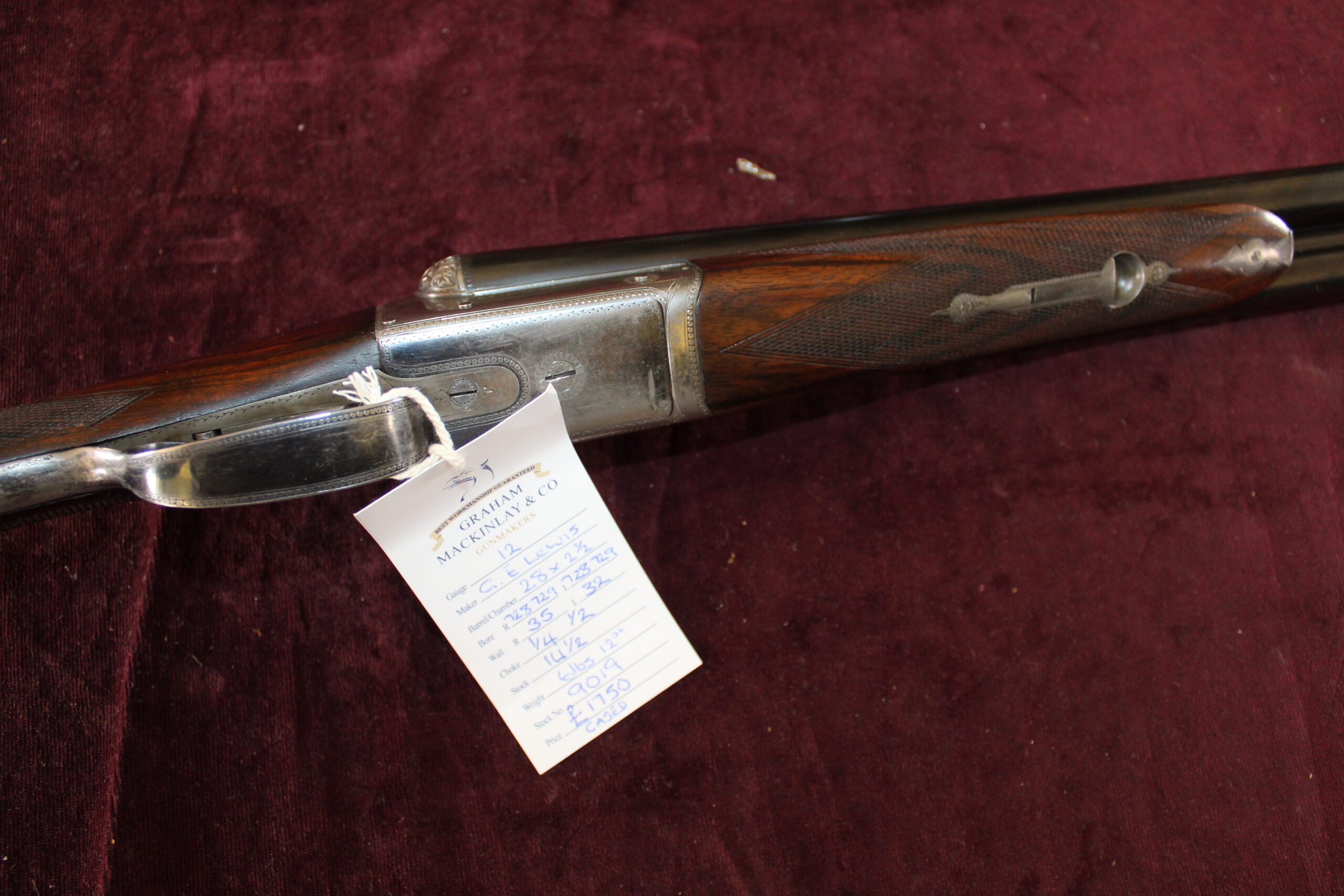 SOLD – This G E Lewis boxlock was built circa 1910.  Replacement barrels measuring 28″ x 2 1/2″ were fitted by the makers, with a third locking grip, and engraving on the top rib reads “G E Lewis & Sons, 32 & 33 Lower Loveday Street, Birmingham”.  A replacement 14 1/2″ well-figured, pistol grip stock and fore-end have also been fitted and the gun has heel and toe plates.  Engraving on the action cover plate, guard etc., is a beaded border and the balls of the action are deeply chiselled with ivy leaves in relief.  Retaining a bloom of colour hardening, the gun has a full spindle lever system, rocker safe and Southgate ejectors.  Although plain, this is an incredibly stylish gun, presented in its case with trade label.  This gun will fire standard steel cartridges.
