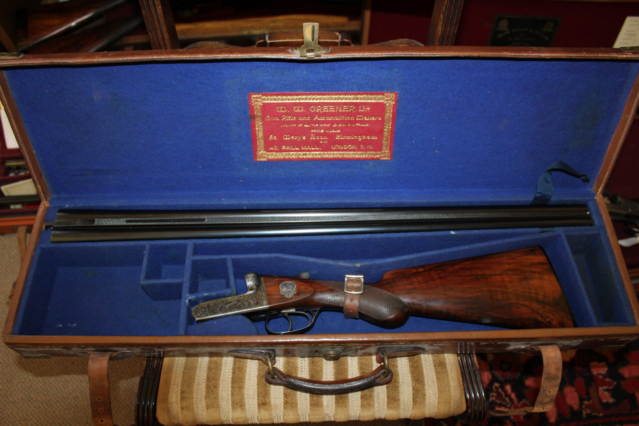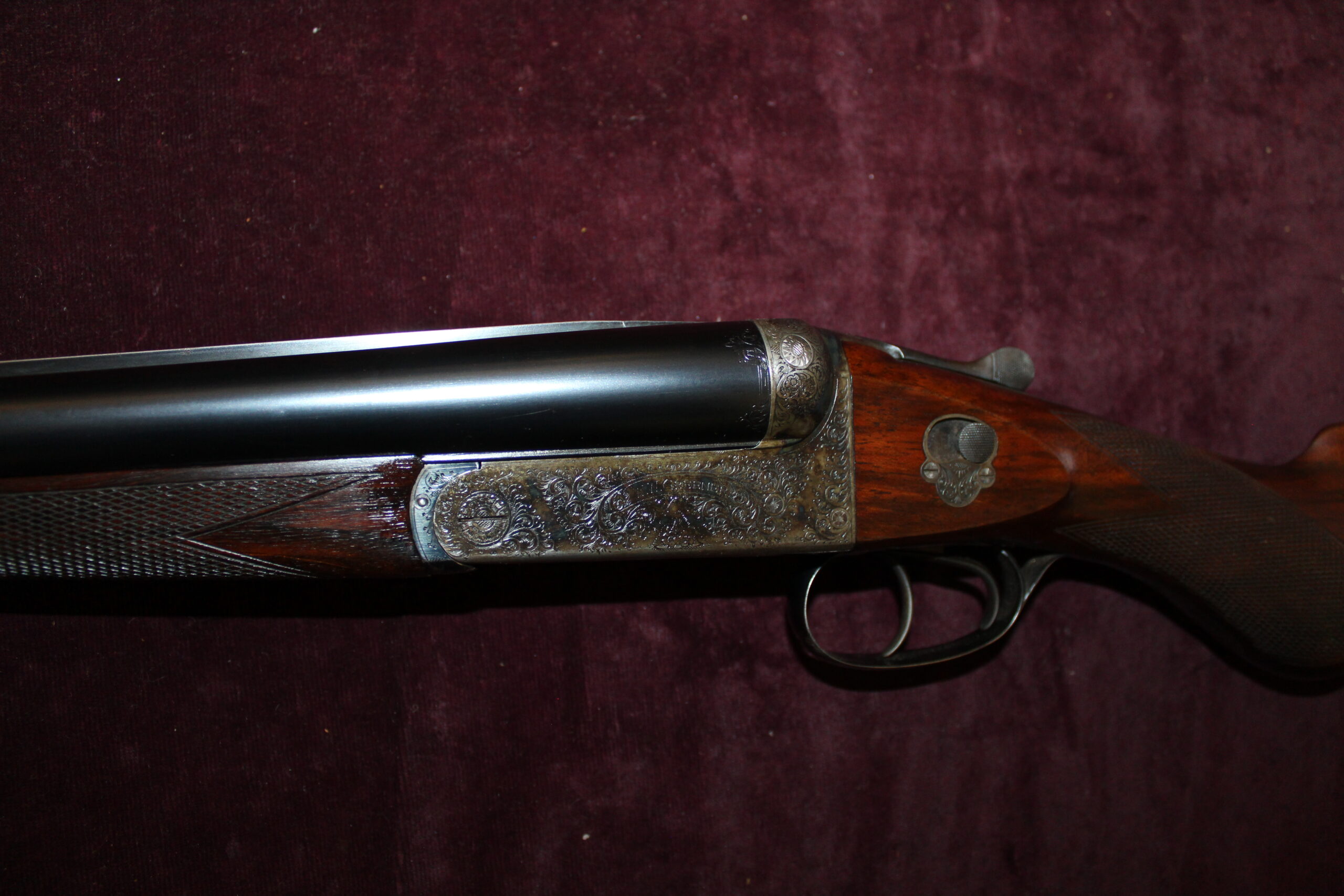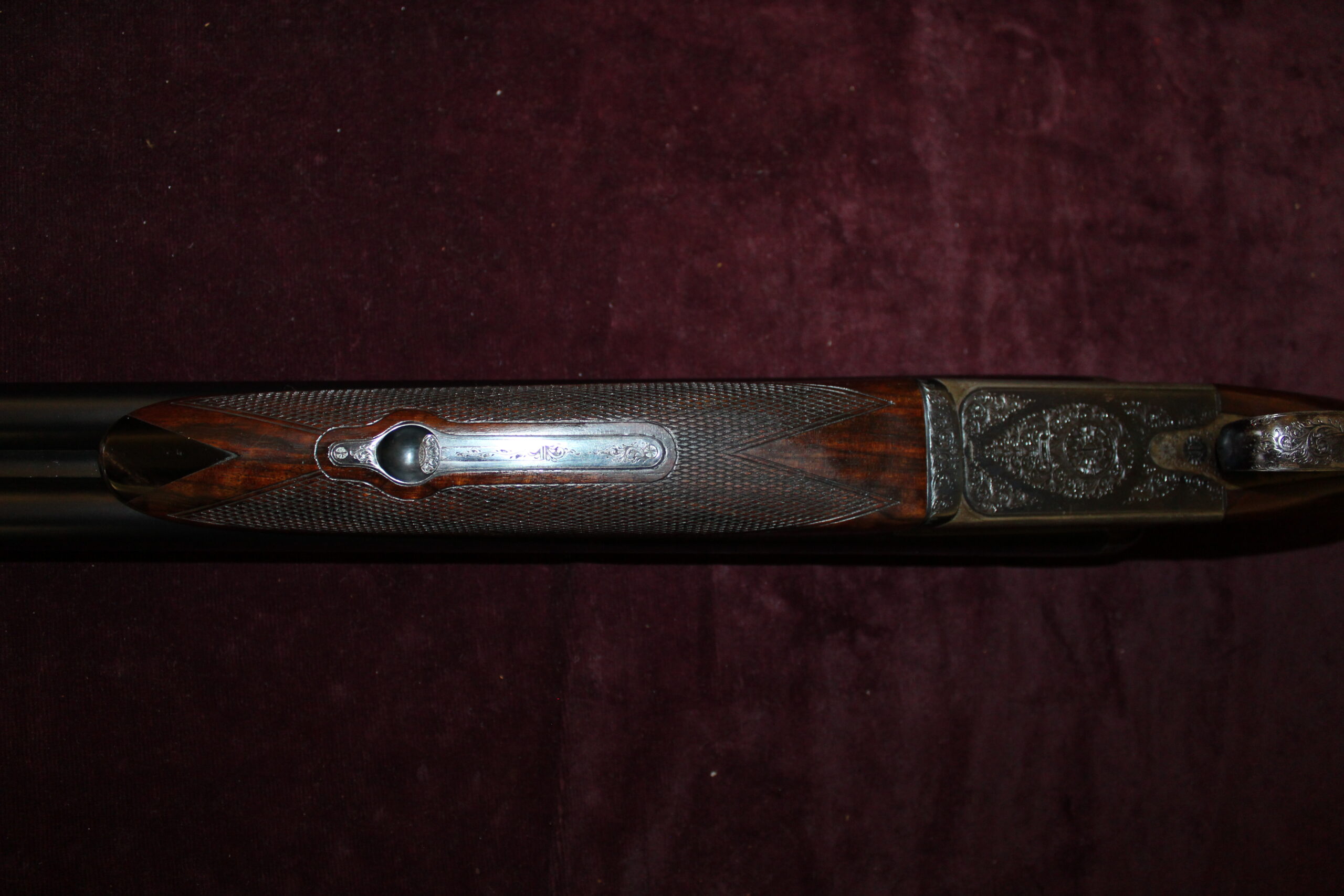 This is one of Greener’s famous ‘Blue Rock’ side-by-side shotguns. Built in the late 50s, this gun is amongst the last ones built, and has 30″ barrels with 3″chambers, choked full and full. Fitted with a tapering, flat, engine-turned top rib which is engraved, “W. W. Greener, Maker, 40 Pall Mall, London Works, Birmingham.” Engraving style on the action is Greener’s fine scrollwork and the flat panel running onto the barrels is of the usual stippled design. The gun has Greener’s manual side safety along with the the famous Greener cross-bolt locking system, a Deeley fore-end catch and Southgate ejectors. Retaining over 95% of its original finish, this gun would make an excellent wild fowler, pigeon gun, or a superb side-by-side clay basher. You don’t see many guns in this condition. It is certainly the best ‘Blue Rock’ I’ve seen.