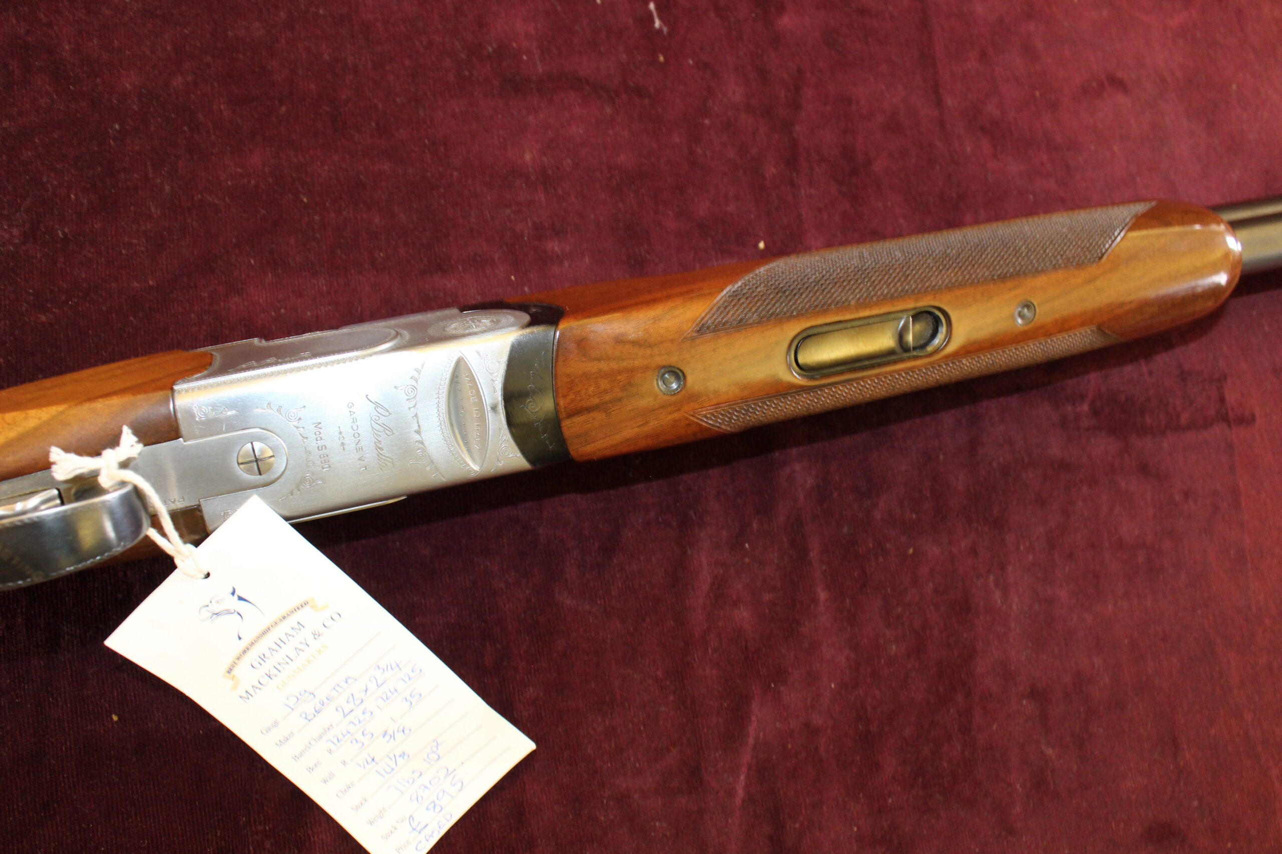 This is a Beretta 680, built in the 70s, I imagine. Barrels have a chequered, ventilated, 10mm, top rib and measure 28″ x 2 3/4″. The gun is border engraved with panels of acanthus scroll and it has an auto-selective safe. A super gun in excellent condition and I suspect quite rare.