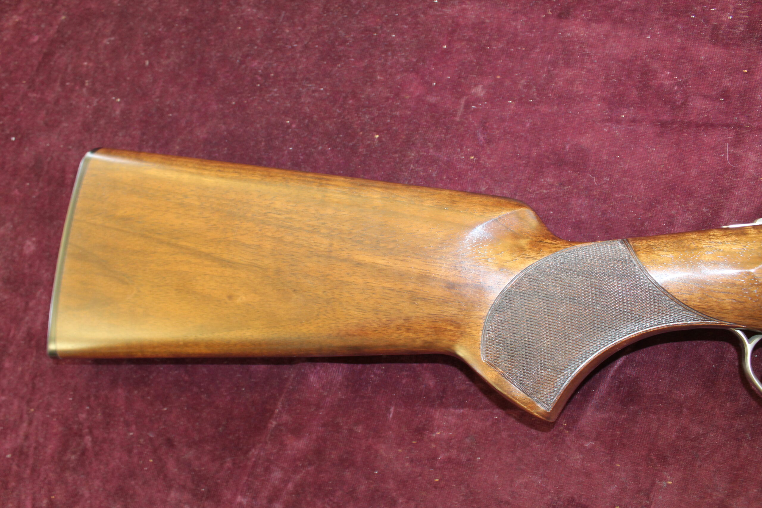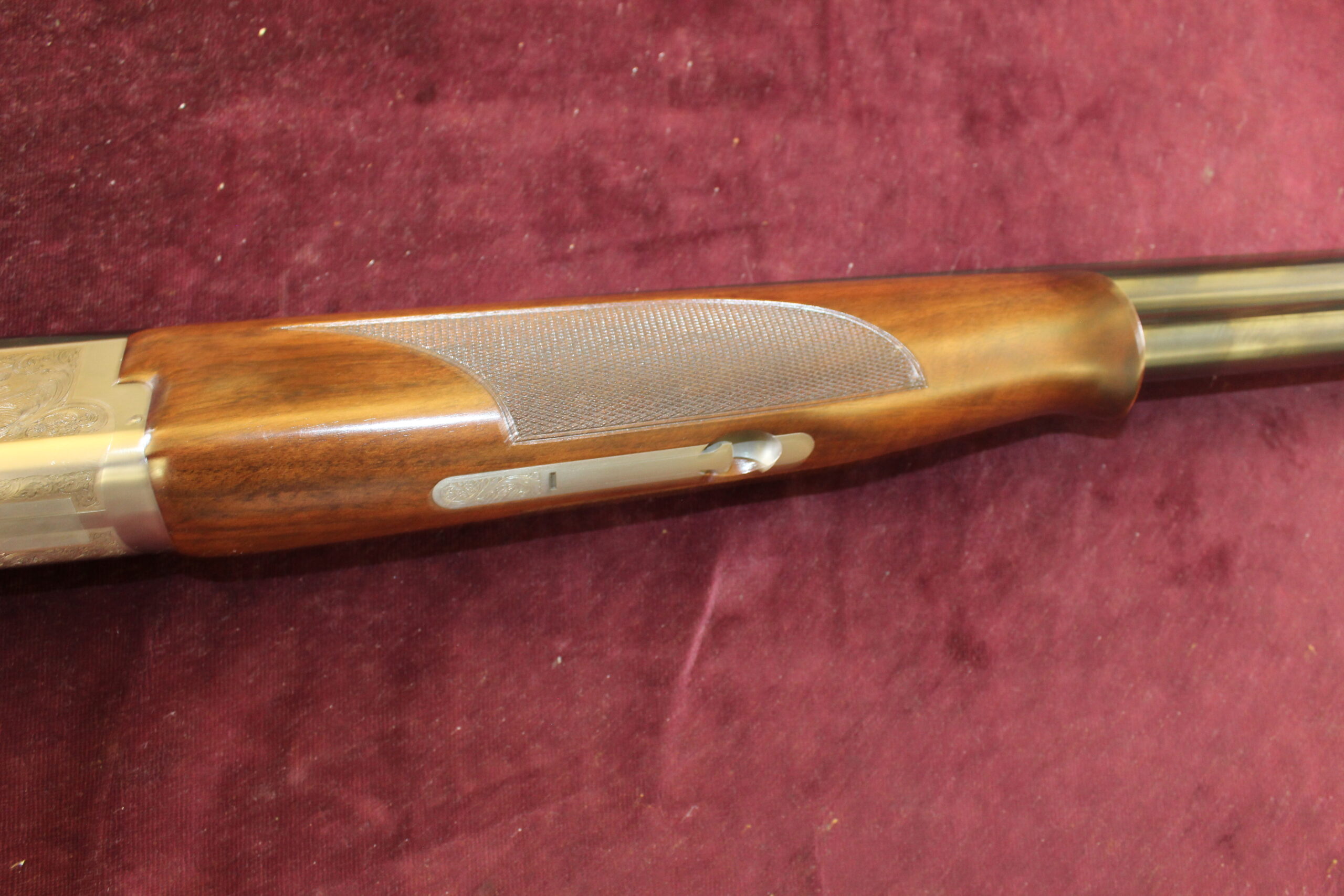 This is a Browning B525 Lightweight multi-choke, with 28″ x 3″ barrels.  Engraving style on the action is bold acanthus scroll and roses with pheasants in flight and settling ducks.   Inlaid in gold on the guard bow is the Browning logo.  Weighing just 6lbs 12oz, the pistol grip stock measures 14 ¾” . Opening and closing like new, this gun is in excellent condition and is presented in its case with spare chokes and accessories.  This gun is steel proved.