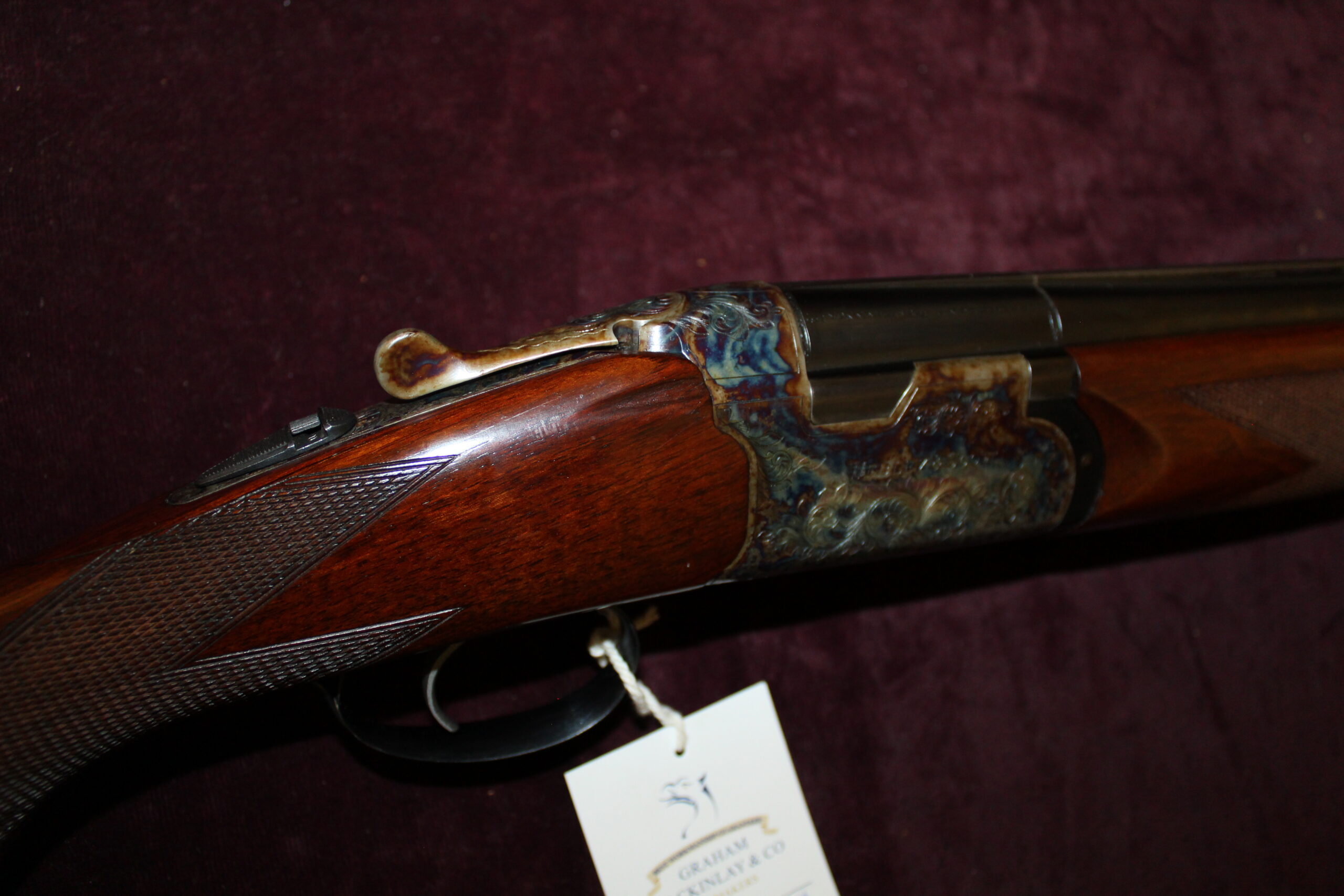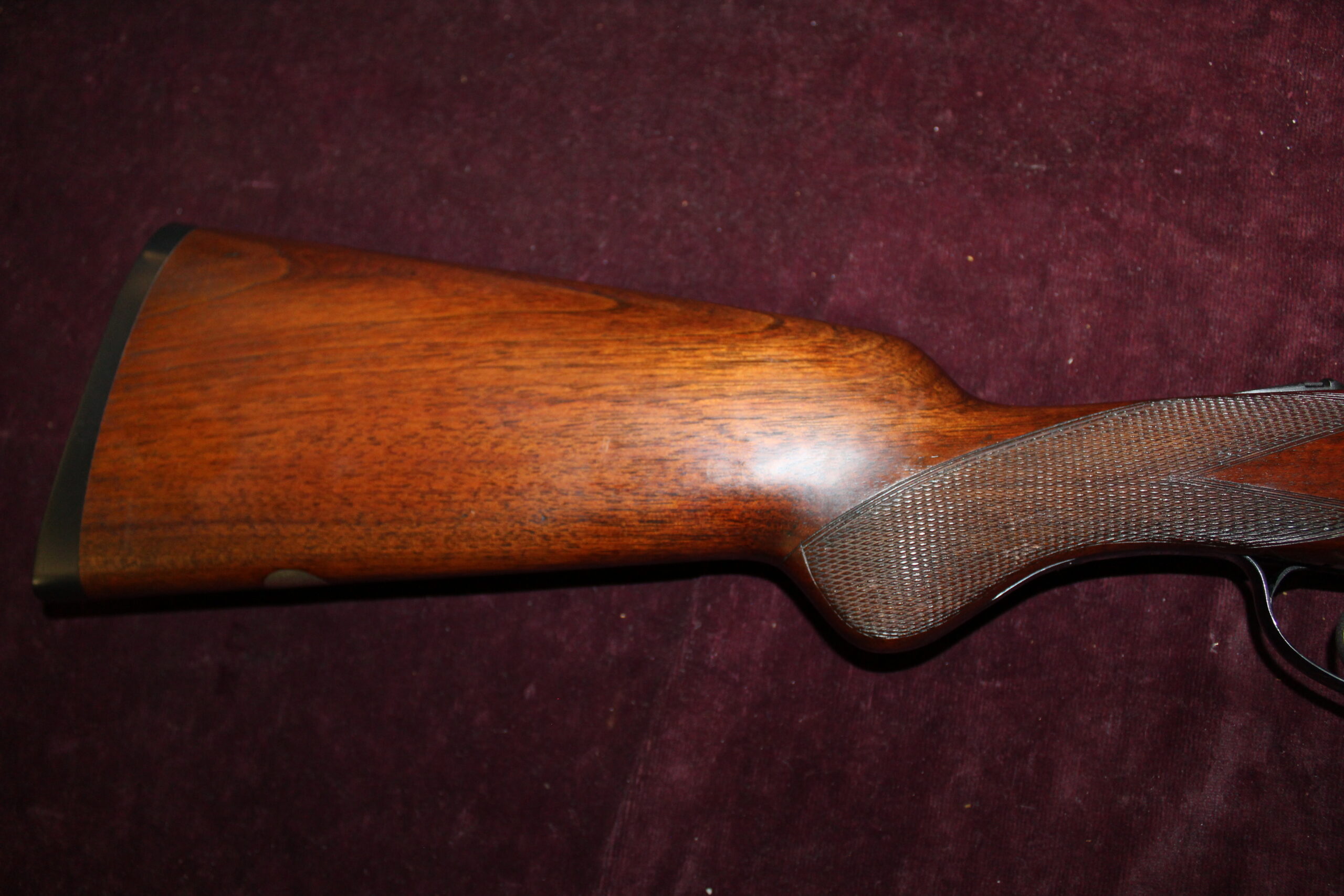 This over and under Webley & Scott was built by Beretta and is likely to date from the 70s, or possibly the early 80s. Barrels measure 28″ with 2 3/4″ chambers and have a narrow cross-filed rib. A Bakelite heel plate takes the stock measurement to 14 1/2″, and the gun is in astonishing condition with the lacquer still visible on the case hardening. There cannot be many guns left, if any, in this condition.