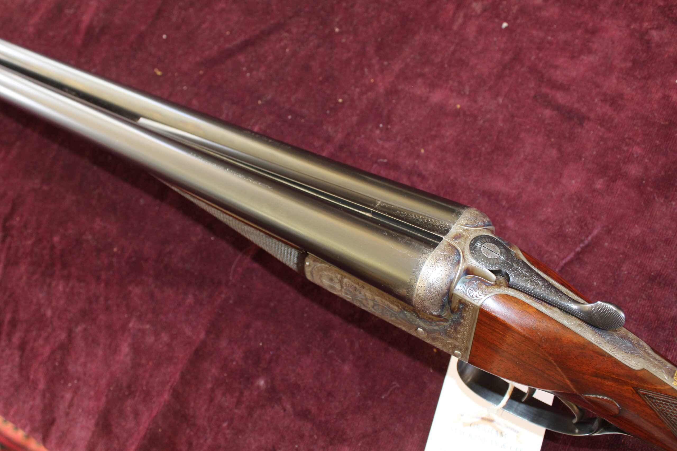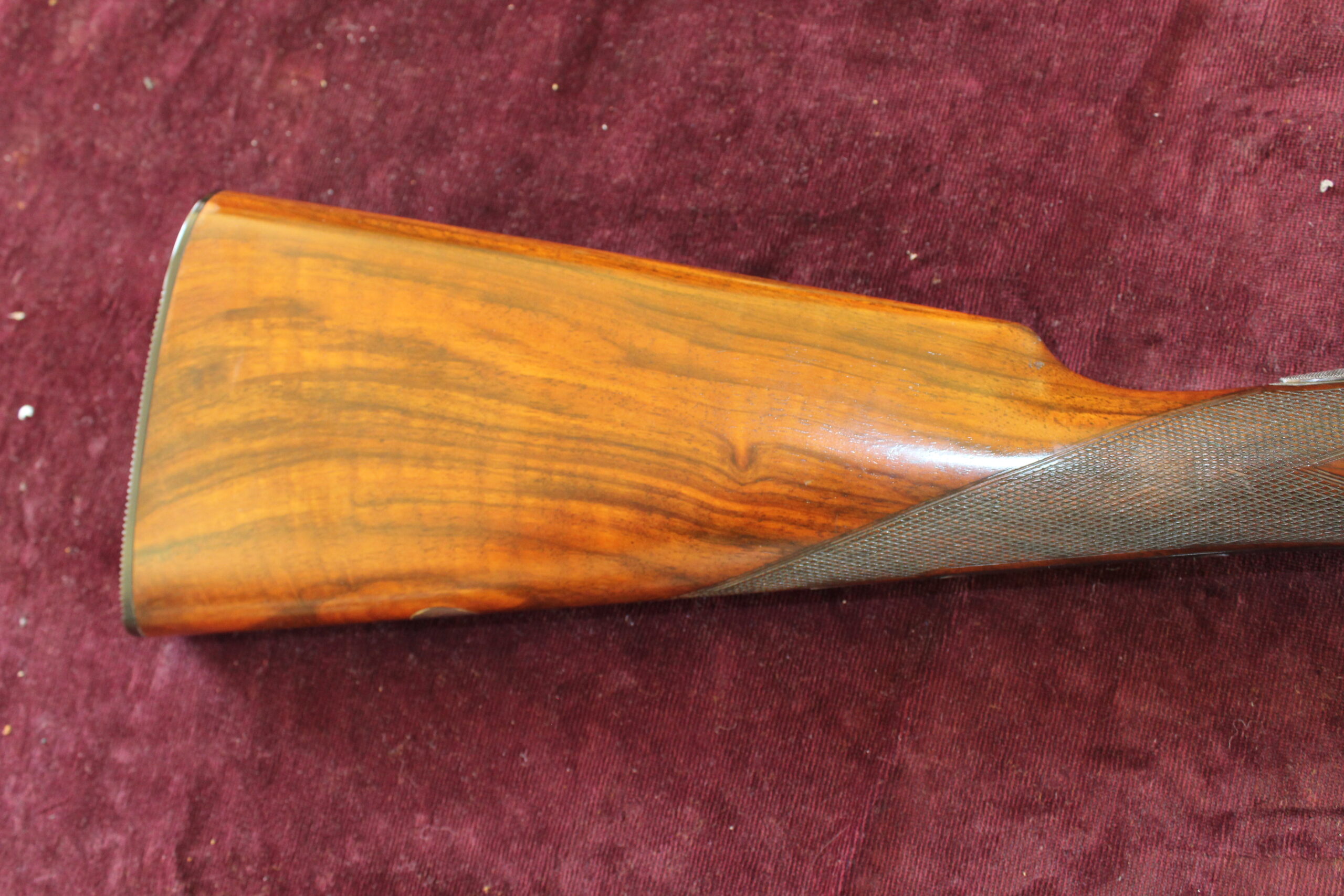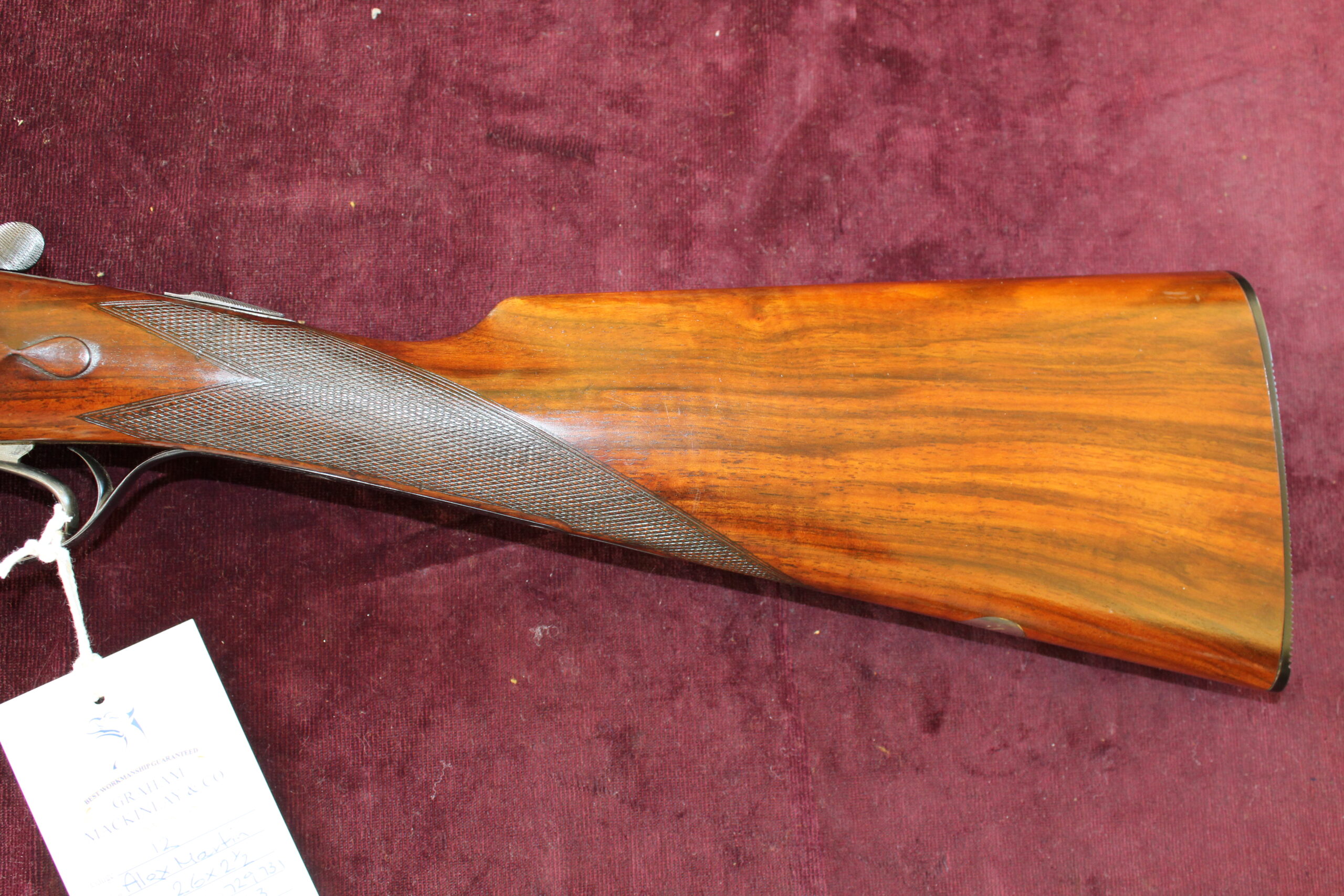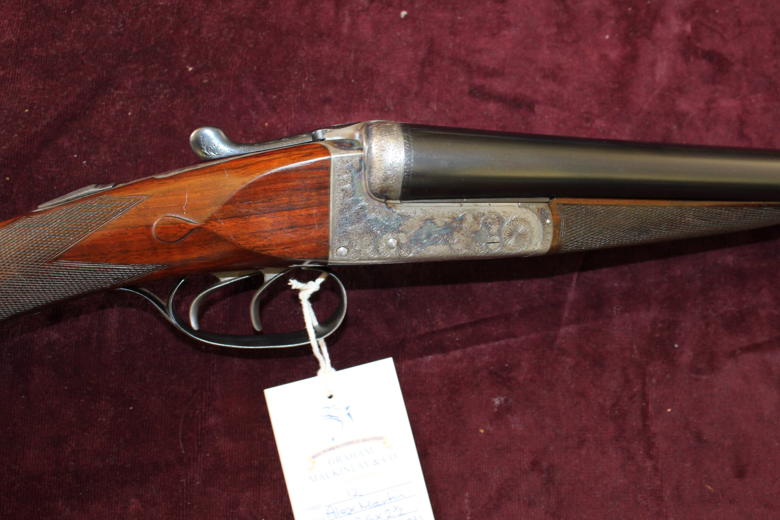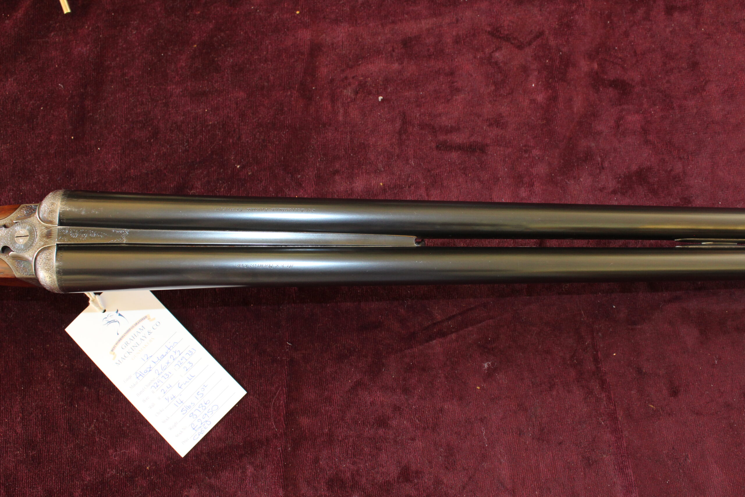 This is one of Alex Martin’s ribless guns, built in the mid-50s, and is quite likely to have been built by AA Brown. Barrels measure 26″ with 2 1/2″ chambers and the barrel tubes read, “Alex Martin Ltd, 20 Exchange Square, Glasgow”. Engraving style on the action, cover plate and trigger guard etc. is scroll with ‘Alex Martin’ signed in a scrolling banner. Retaining 80% of its original hardening colour, the gun has a full spindle lever system, a roller safe and Southgate ejectors. The straight-hand 14″ well-figured stock has panels and teardrops and includes a buffalo horn heel plate and the gun is presented in a lightweight leather case. This would make a fabulous walked-up gun as it weighs less than 6lbs.