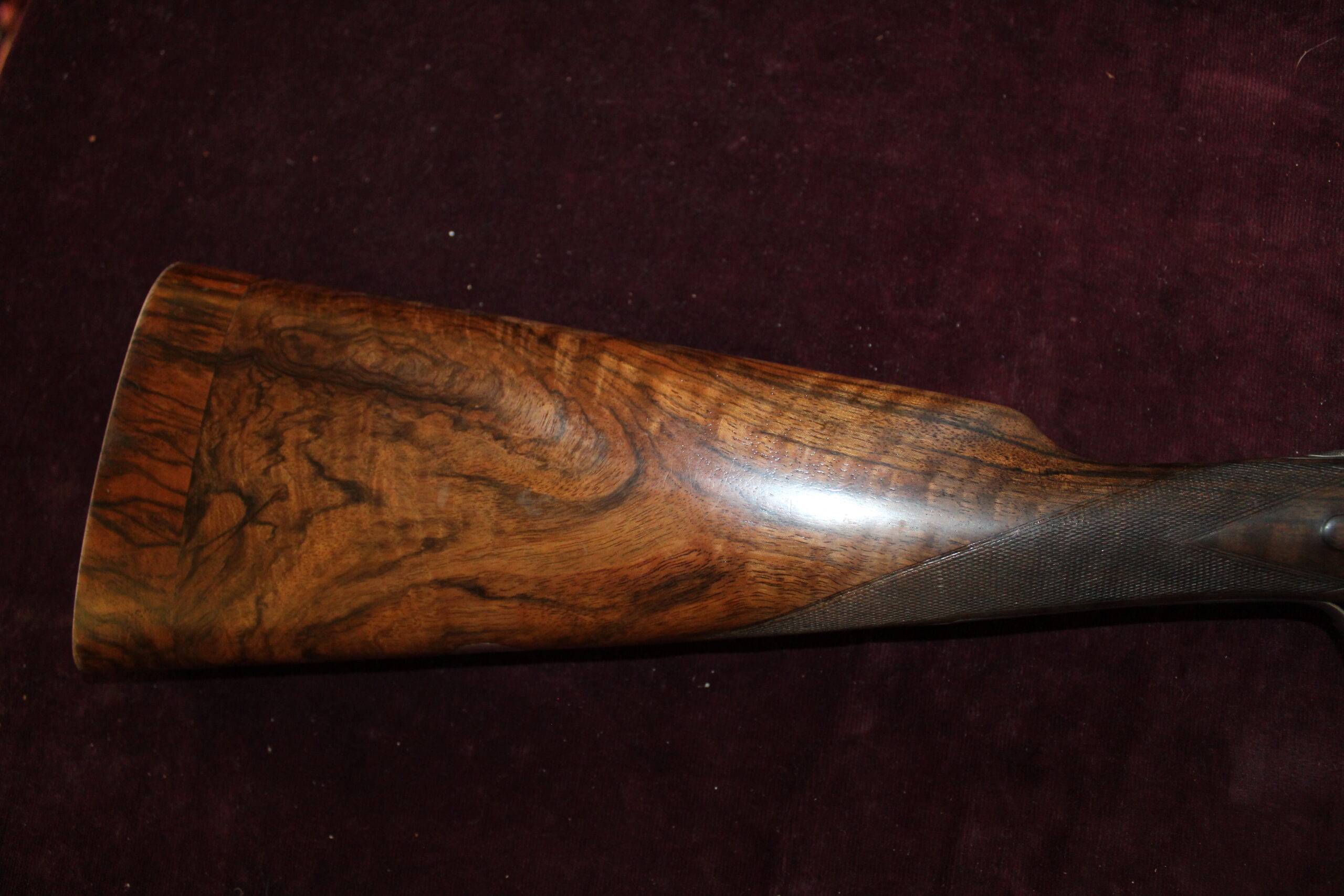 Likely built in the 1930s, this gun features 26″ x 2½” steel barrels, with Southgate ejectors and an Anson Fore-end. Engraving style on the locks and action is bold acanthus scroll with “Charles Hellis & Sons” inscribed in a scrolling banner on the action and “Charles Hellis & Sons Ltd, 121 & 123 Edgware Road, Hyde Park, London”. engraved on the top rib. Measurements on the highly figured, straight-hand stock are 15½ including a well-matched 1½” extension piece.