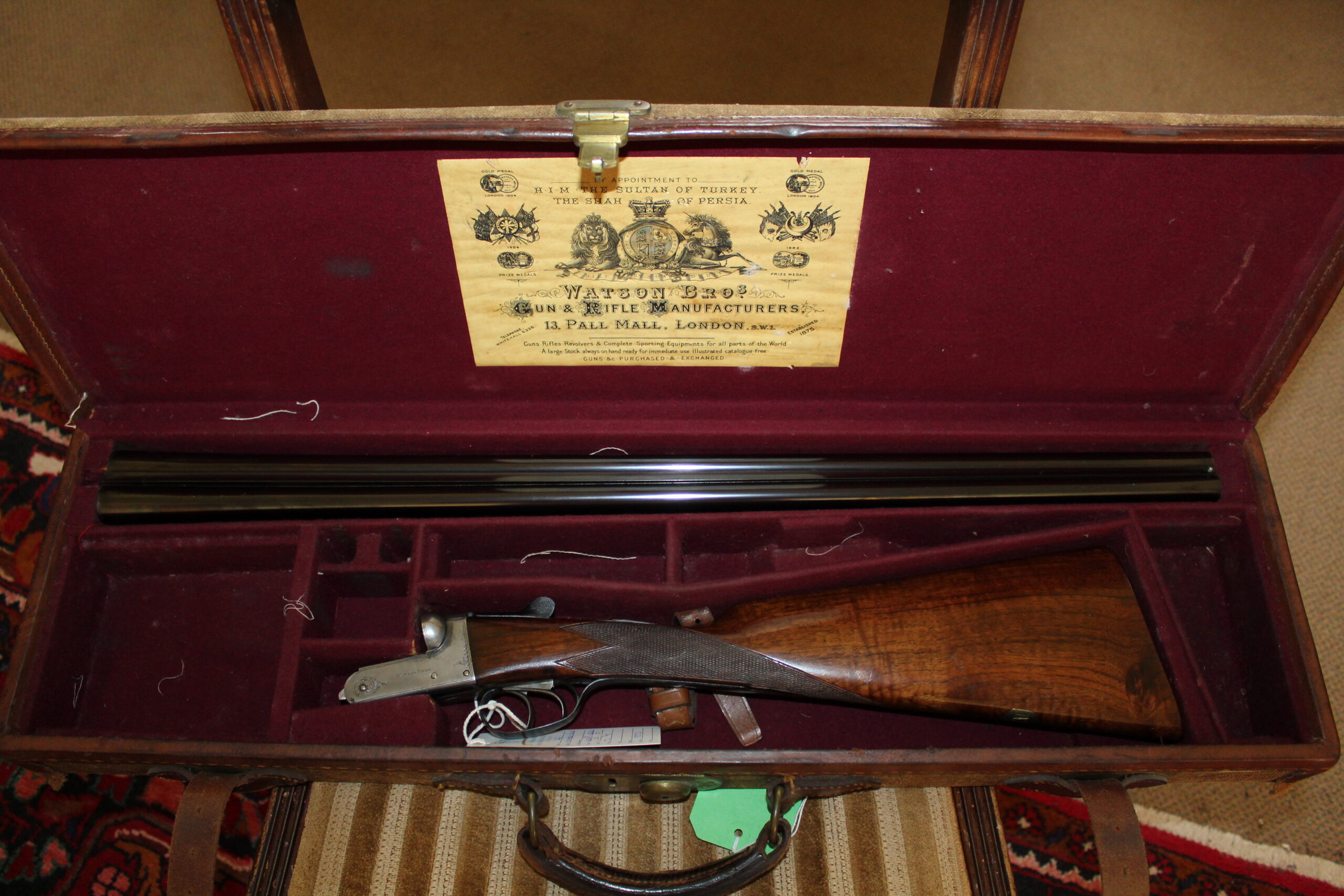 This little gun, although plain, is in very clean, honest condition. Steel barrels measure 28″ x 2 3/4″ chambers and the gun is choked true cylinder and 3/8. Engraved on the barrel tubes is “Watson Bros, 7 Bury Street, St James’s, London”. The action is border engraved with some light scroll engraving, and is signed “Watson Bros”. The gun has a 14 1/2″ straight-hand stock, a snap-on Hackett fore-end and the action is fitted with a full spindle lever system. Presented in its canvas and leather case with trade label. This gun will be capable of firing standard steel cartridges without alteration.