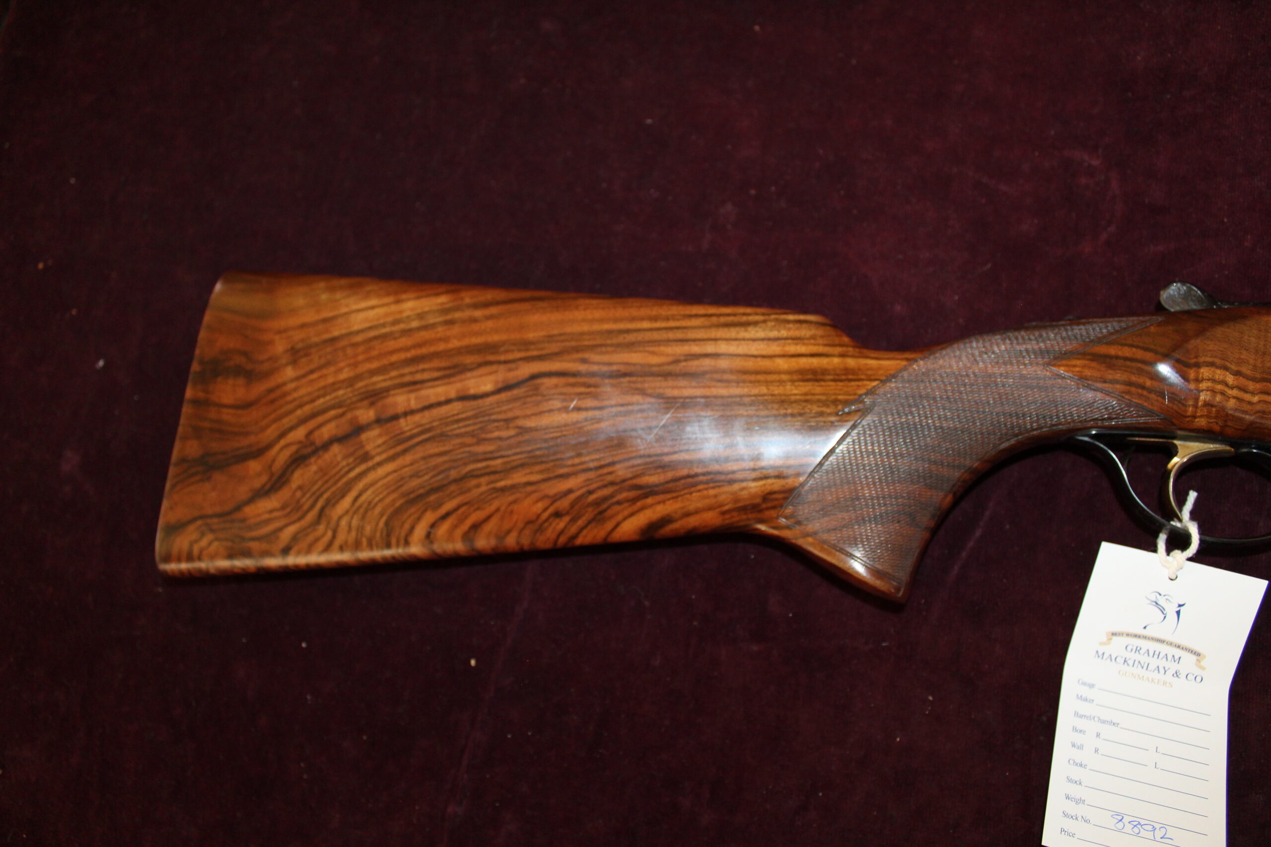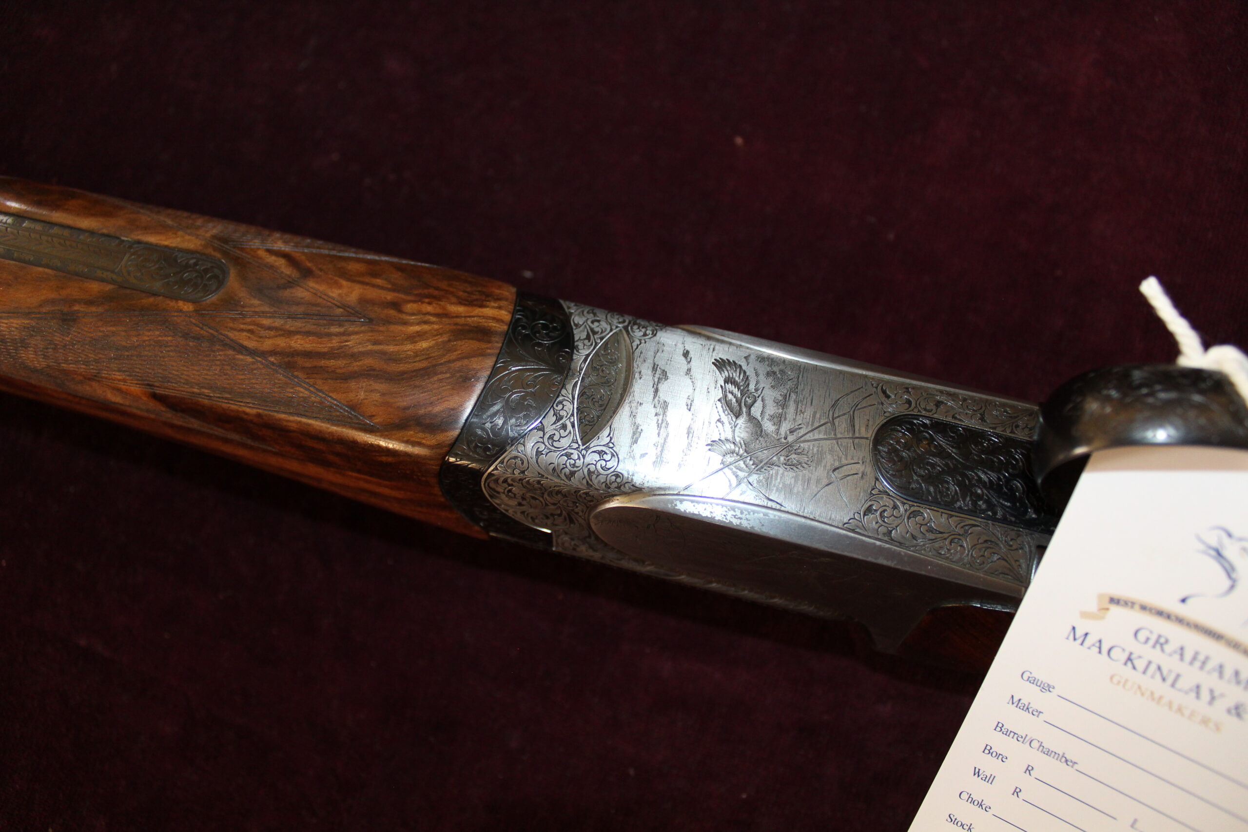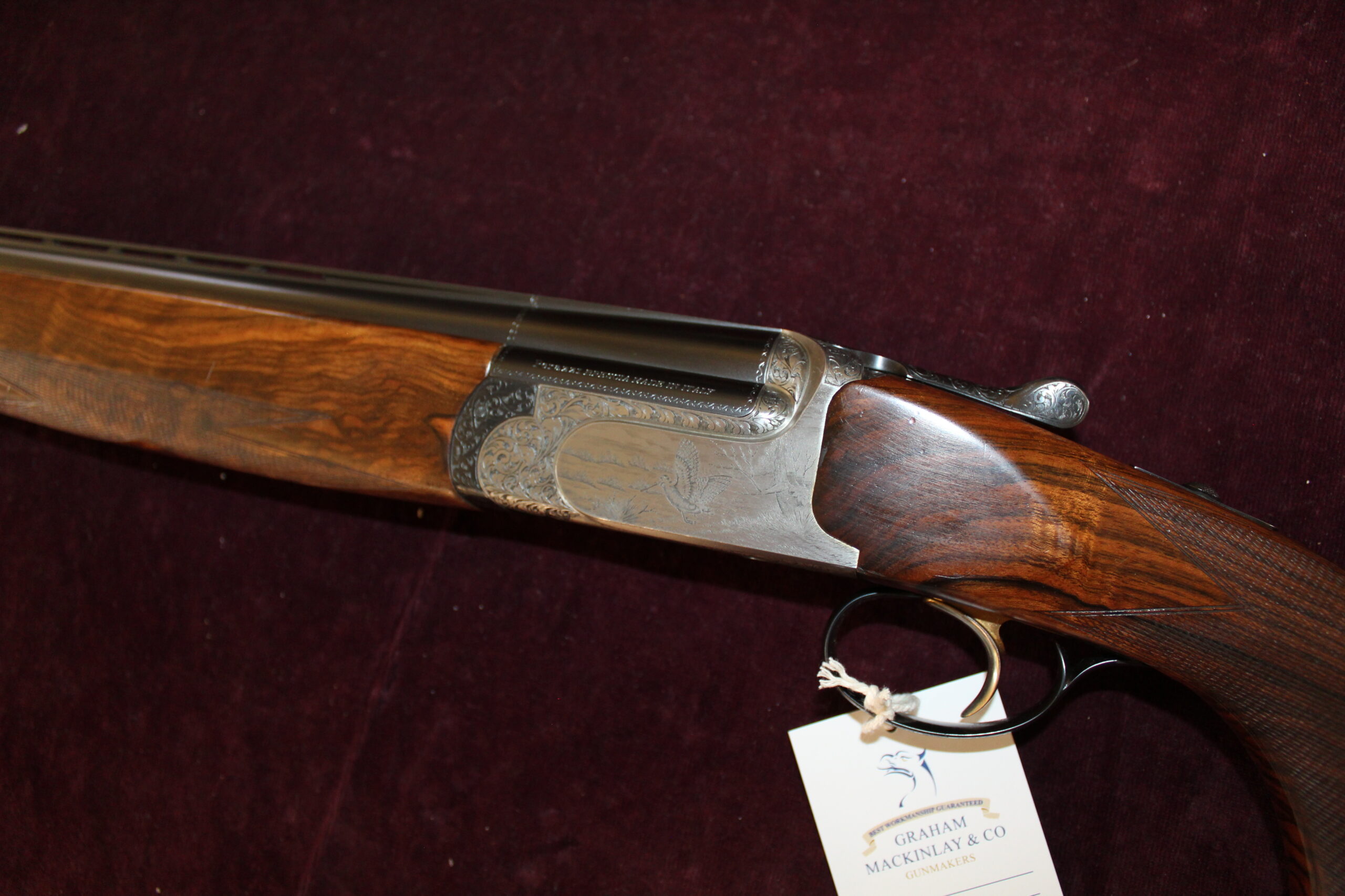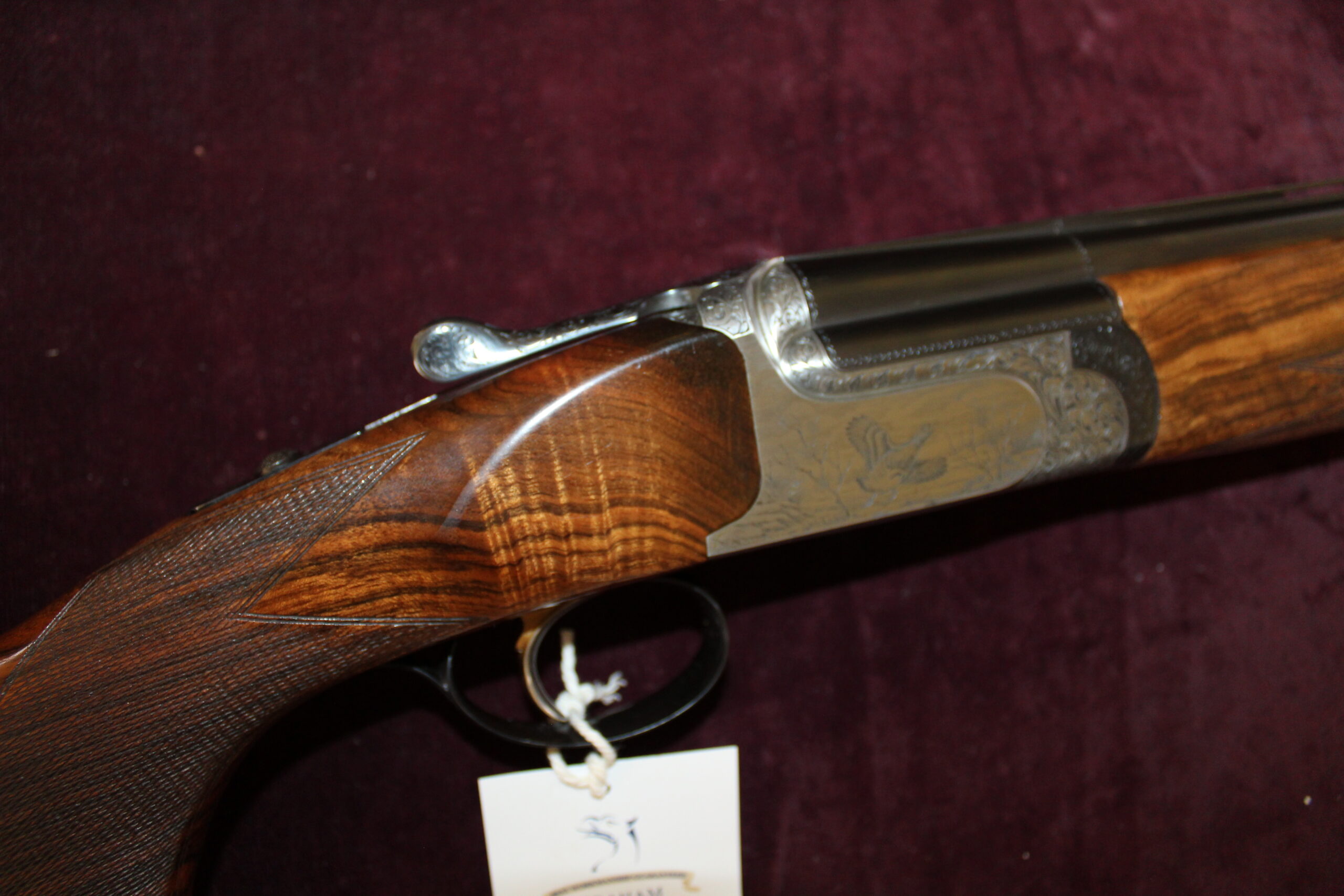 This super little gun is an SC3. Barrels measure 29 1/2″ x 2 3/4″ with a narrow cross-filed ventilated top rib. Engraving style on the action is beautiful bold acanthus and game scene, with grey partridge on the right-hand side, settling duck on the underside and flushing woodcock on the left. All beautifully handled. The highly figured stock measures 14 3/8″ to centre, and the gun is fitted with Perazzi’s detachable trigger assembly. Presented in its case with original paperwork, spare strikers and mainsprings. With the chokes altered this gun will be capable of firing standard steel cartridges.
