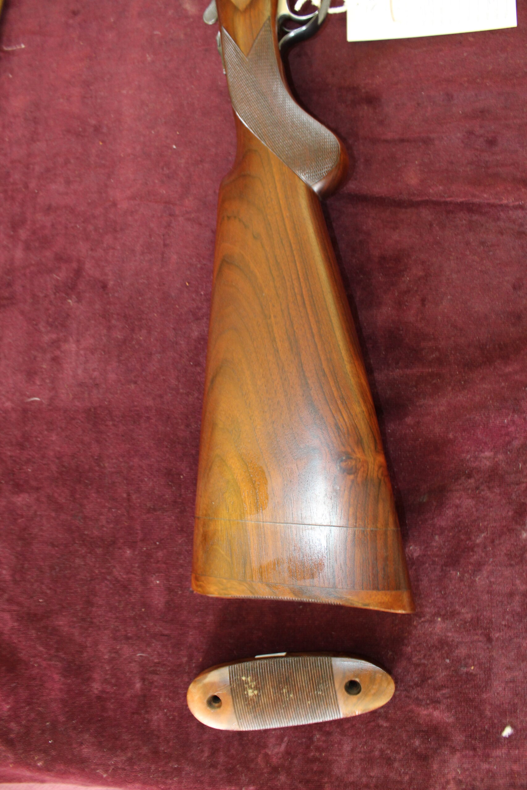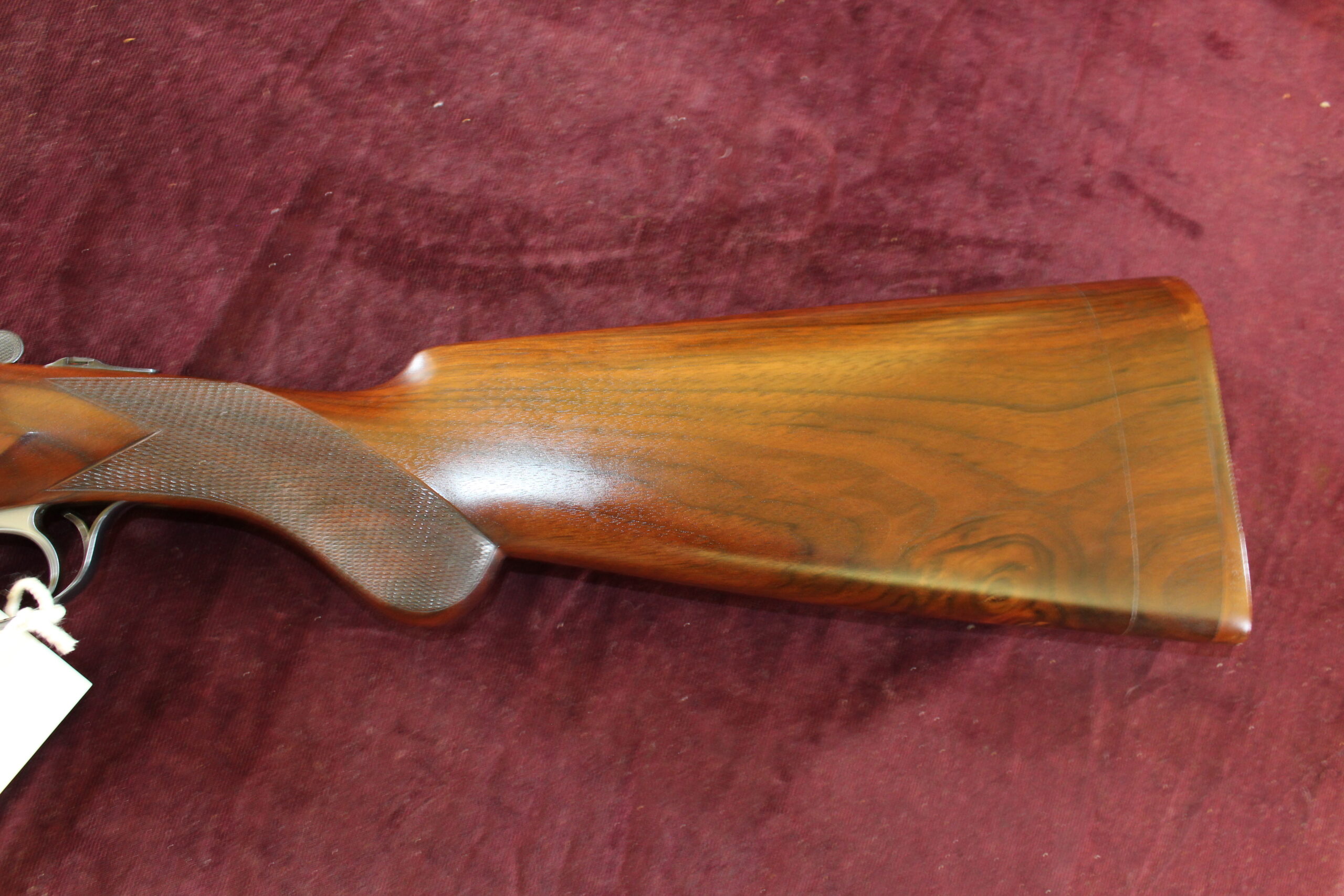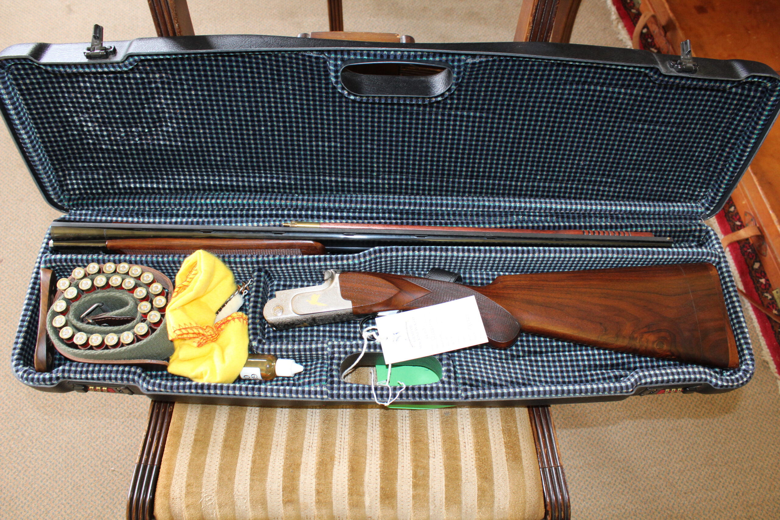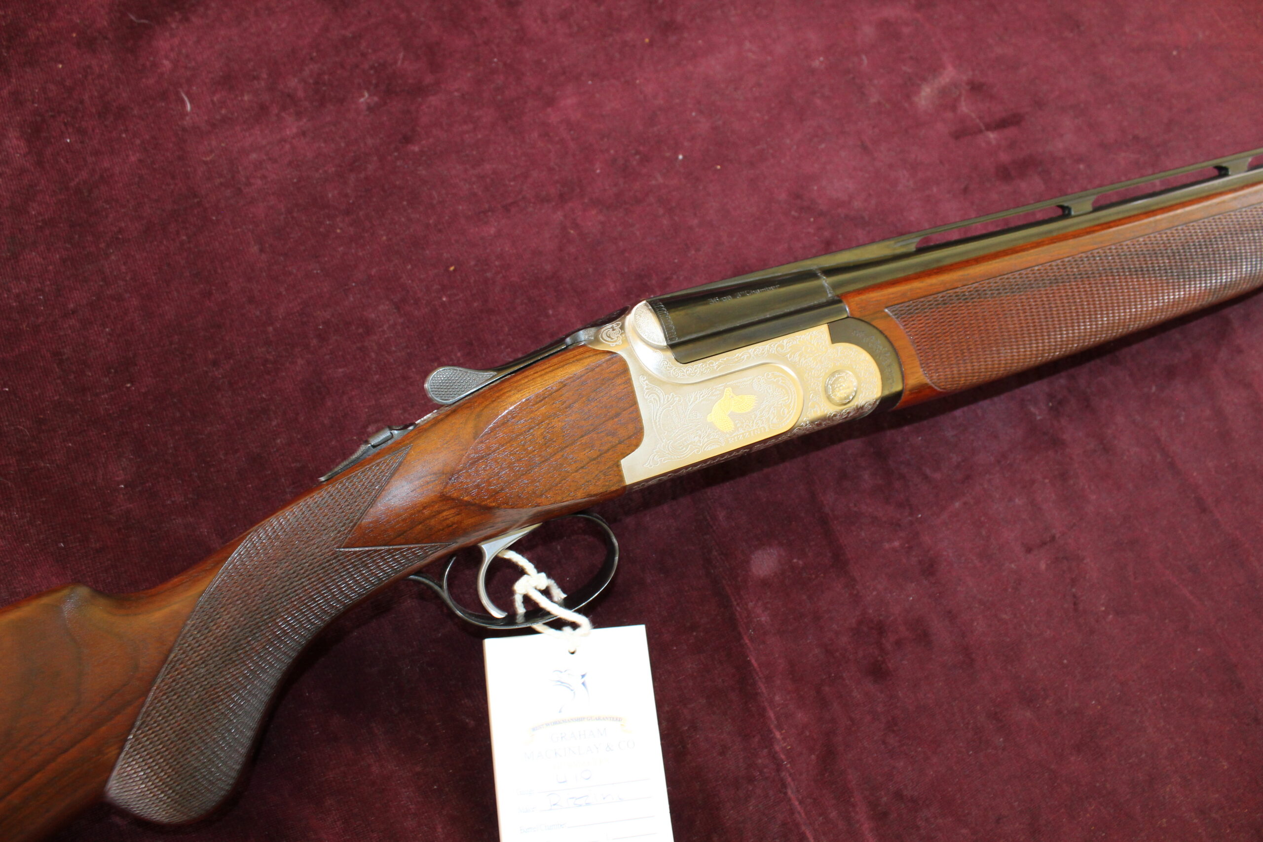 This is one of Rizzini’s .410 over and under shotguns. Stock length is 13″, however the original off-cut is there to extend the stock to 14 1/2″. Barrels measure 28″ x 3″ and have fixed chokes of 1/4 and 1/2. Engraving on the action body is acanthus scroll and gold inlay, and the gun has an Anson fore-end, a top auto selective safe and a single trigger. The gun is in excellent condition and has had very little use. Weighing in at 5lbs 7 oz, this will make a great starting gun and it comes in its makers’ case with a .410 cartridge belt with 25 cartridges. A super wee gun.