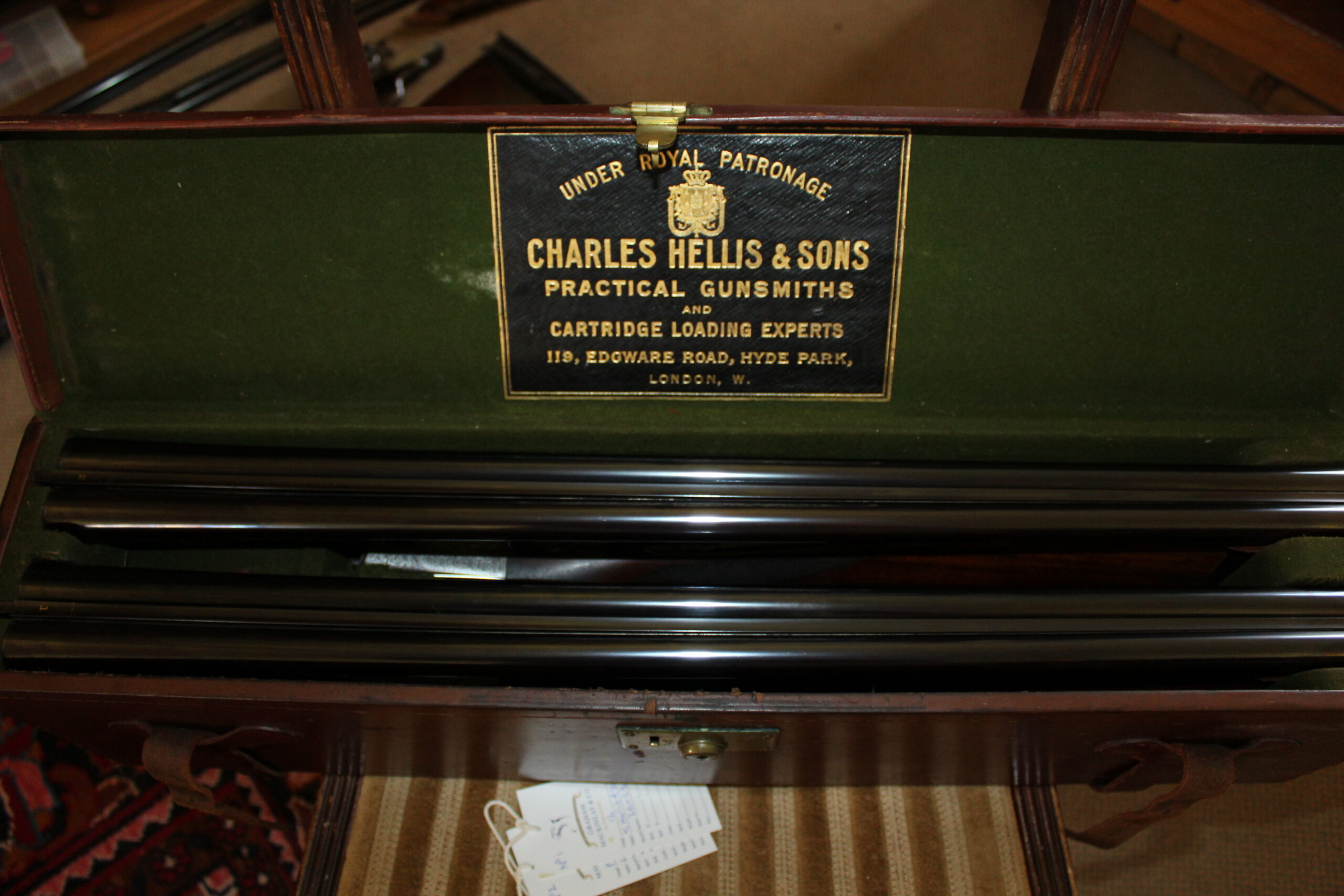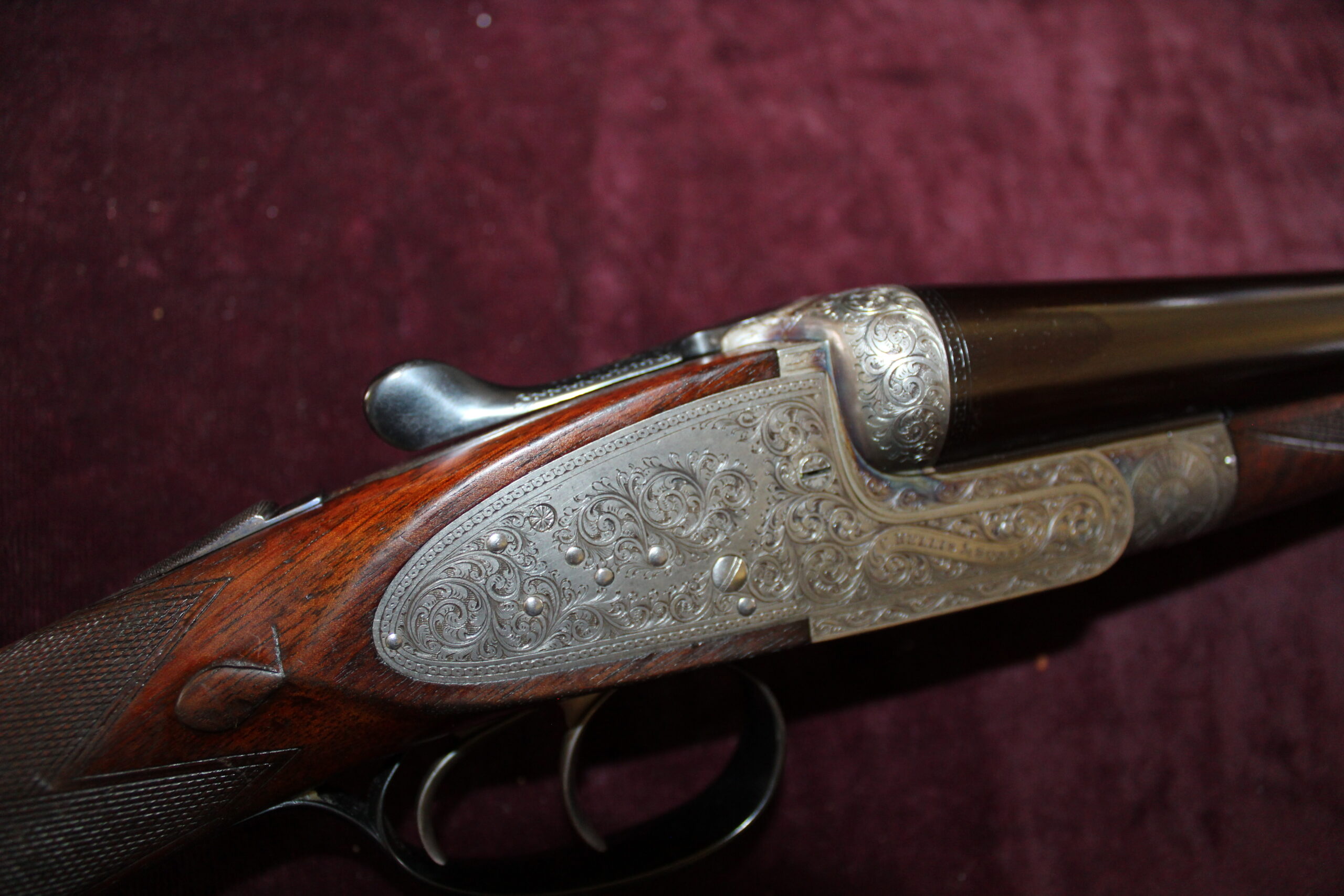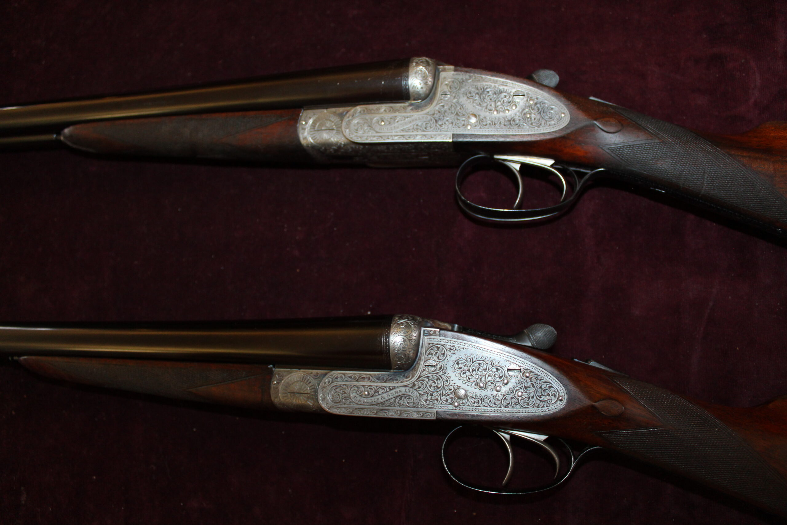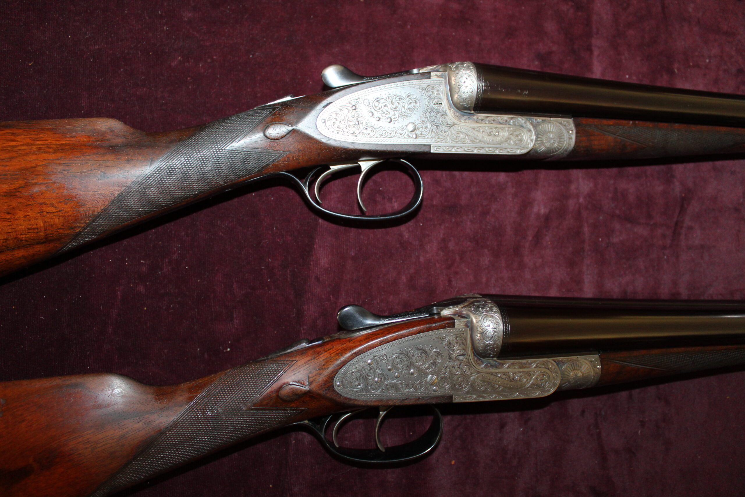 Built circa 1935, this matched pair of guns has 26″ x 2 1/2″ steel barrels choked 1/4 and full. Numbers “1” and “2” are inlaid in gold on the fore-end tips, top levers, and barrel breech ends. Engraving style on the actions and locks is bold acanthus, framed by beaded borders, and the guns retain traces of their original colour hardening. Both guns have rolled-edge trigger guards. The stocks differ slightly, with one including a wooden extension whilst the other has a Silver’s pad. The No. 1 gun is fitted with three escutcheon plates, the No. 2 gun has two, however, these could be easily matched. Presented in their original double motor case, these guns have remained in the same family since new.